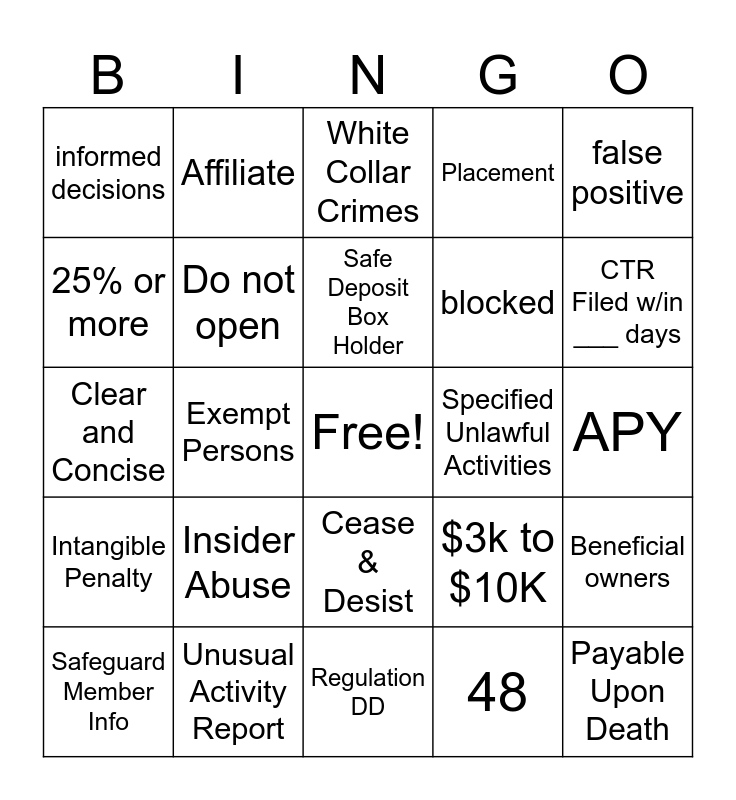 This bingo card has a free space and 33 words: Cyber Crimes, Member Due Diligence, Exempt Persons, Romance Scam, Intangible Penalty, Do not open, false positive, Safeguard Member Info, Affiliate, Payment History, Safe Deposit Box Holder, White Collar Crimes, Embezzlement, Illegal Gun Sales, Specified Unlawful Activities, CTR Filed w/in ___ days, Unusual Activity Report, Clear and Concise, Insider Abuse, $3k to $10K, Cease & Desist, NPI, informed decisions, APY, Regulation DD, Payable Upon Death, Placement, blocked, 25% or more, Beneficial owners, Identity theft, 48 and Facta.