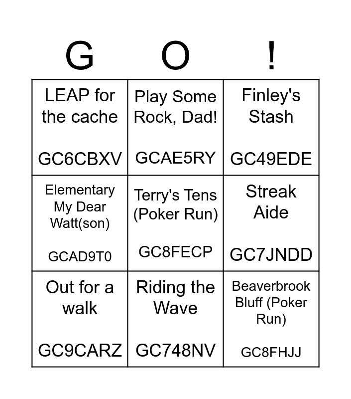 This bingo card has 17 words: Daddy's Girl Ottawa GC1NPDJ, Eagleson Lookout GC2CH1A, Finley's Stash GC49EDE, LEAP for the cache GC6CBXV, Riding the Wave GC748NV, Streak Aide GC7JNDD, Puck Handler GC85KB2, Terry's Tens (Poker Run) GC8FECP, Beaverbrook Bluff (Poker Run) GC8FHJJ, Out for a walk GC9CARZ, The Art of Geocaching GCA87RY, Dead end GCAB3P2, Elementary My Dear Watt(son) GCAD9T0, Play Some Rock, Dad! GCAE5RY, Summer Solstice - Never Enough Time GCAT040, Water to the left of me, water to the right GCAP196 and Seammett GCAV63J.