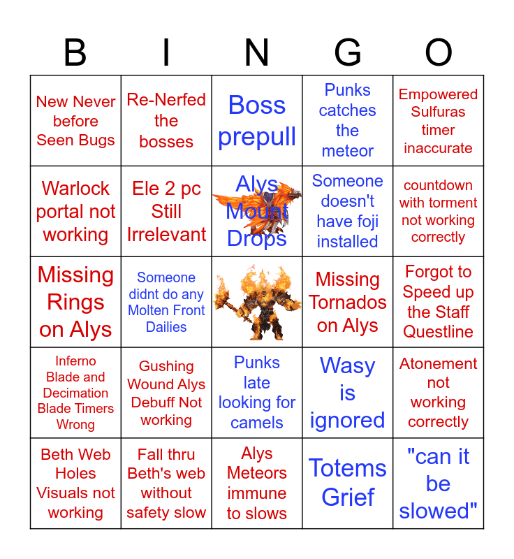 This bingo card has 1 images, a free space and 24 words: Gushing Wound Alys Debuff Not working, Fall thru Beth's web without safety slow, Alys Mount Drops, Beth Web Holes Visuals not working, Empowered Sulfuras timer inaccurate, New Never before Seen Bugs, Warlock portal not working, Re-Nerfed the bosses, Missing Tornados on Alys, Punks late looking for camels, Someone doesn't have foji installed, Missing Rings on Alys, Wasy is ignored, Atonement not working correctly, Ele 2 pc Still Irrelevant, Totems Grief, Forgot to Speed up the Staff Questline, Boss prepull, countdown with torment not working correctly, Someone didnt do any Molten Front Dailies, "can it be slowed", Inferno Blade and Decimation Blade Timers Wrong, Punks catches the meteor and Alys Meteors immune to slows.