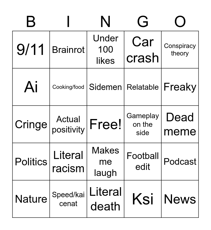 This bingo card has a free space and 24 words: Literal racism, Speed/kai cenat, Sidemen, Nature, Conspiracy theory, 9/11, Ai, Brainrot, Gameplay on the side, Makes me laugh, Relatable, Cringe, Football edit, Podcast, Cooking/food, Ksi, Dead meme, Under 100 likes, Freaky, Actual positivity, News, Politics, Car crash and Literal death.
