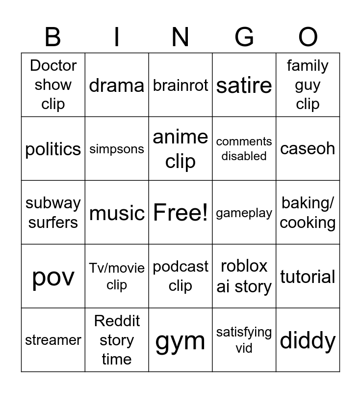 This bingo card has a free space and 24 words: Tv/movie clip, Reddit story time, anime clip, streamer, family guy clip, Doctor show clip, politics, drama, gameplay, podcast clip, comments disabled, subway surfers, roblox ai story, tutorial, simpsons, satisfying vid, baking/ cooking, brainrot, caseoh, music, diddy, pov, satire and gym.