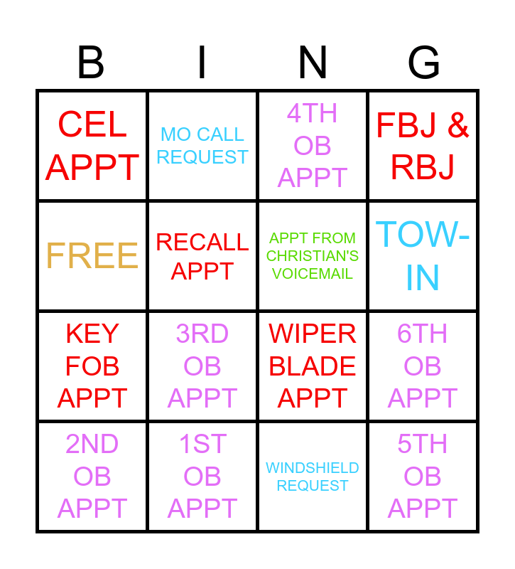 This bingo card has 16 words: 1ST OB APPT, 6TH OB APPT, 4TH OB APPT, CEL APPT, KEY FOB APPT, MO CALL REQUEST, WIPER BLADE APPT, WINDSHIELD REQUEST, FREE, RECALL APPT, 2ND OB APPT, FBJ & RBJ, 3RD OB APPT, TOW-IN, APPT FROM CHRISTIAN'S VOICEMAIL and 5TH OB APPT.