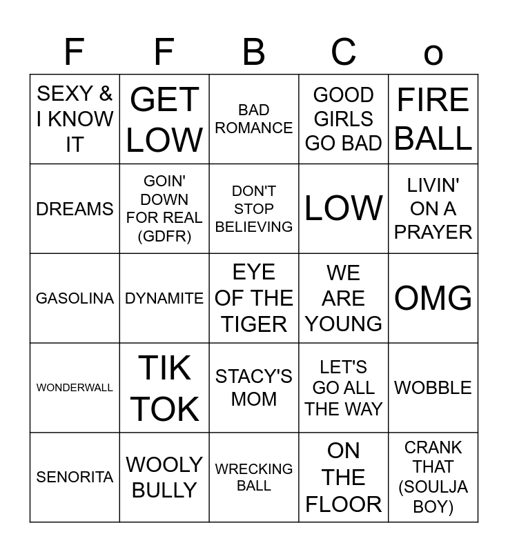 This bingo card has 75 words: AFRICA, ANIMALS, BAD ROMANCE, BOHEMIAN RHAPSODY, BRASS MONKEY, BREAK YOUR HEART, CAKE BY THE OCEAN, CALL ON ME, CEILING CAN'T HOLD US, CONGRATULATIONS, CRANK THAT (SOULJA BOY), DANCE MONKEY, DON'T STOP BELIEVING, DREAMS, DROP IT LIKE IT'S HOT, DYNAMITE, EMPIRE STATE OF MIND, EYE OF THE TIGER, FEELS SO CLOSE, FIRE BALL, FISHIN' IN THE DARK, GASOLINA, GOIN' DOWN FOR REAL (GDFR), GET LOW, GOOD GIRLS GO BAD, HEAT WAVES, HEY YA, HOLLABACK GIRL, I GOTTA FEELING, I KNOW YOU WANT ME, I LOVE THIS BAR, I'M ON A BOAT, KICK START MY HEART, LET'S GO ALL THE WAY, LIVIN' ON A PRAYER, LOW, MR. BRIGHTSIDE, MY HOUSE, OMG, ON THE FLOOR, PARTY IN THE U.S.A., PARTY ROCK ANTHEM, POKER FACE, PROMISCUOUS, RIGHT ROUND, SAVE A HORSE (RIDE A COWBOY), SENORITA, SEXY & I KNOW IT, SEXYBACK, SHUT UP & DANCE WITH ME, SORRY NOT SORRY, STACY'S MOM, SUCKER, SUPER BASS, SUPERSTAR, SWEET CHILD O' MINE, TAKE IT ALL BACK, TENNESSEE WHISKEY, THIS IS HOW WE DO IT, THUNDER, TIK TOK, TUBTHUMPING, UPTOWN FUNK, WAGON WHEEL, WE ARE NEVER EVER EVER GETTING BACK TOGETHER, WE ARE YOUNG, WHERE THEM GIRLS AT, WHO AM I (WHAT'S MY NAME), WILD ONES, WOBBLE, WONDERWALL, WOOLY BULLY, WOW, WRECKING BALL and YEAH!.