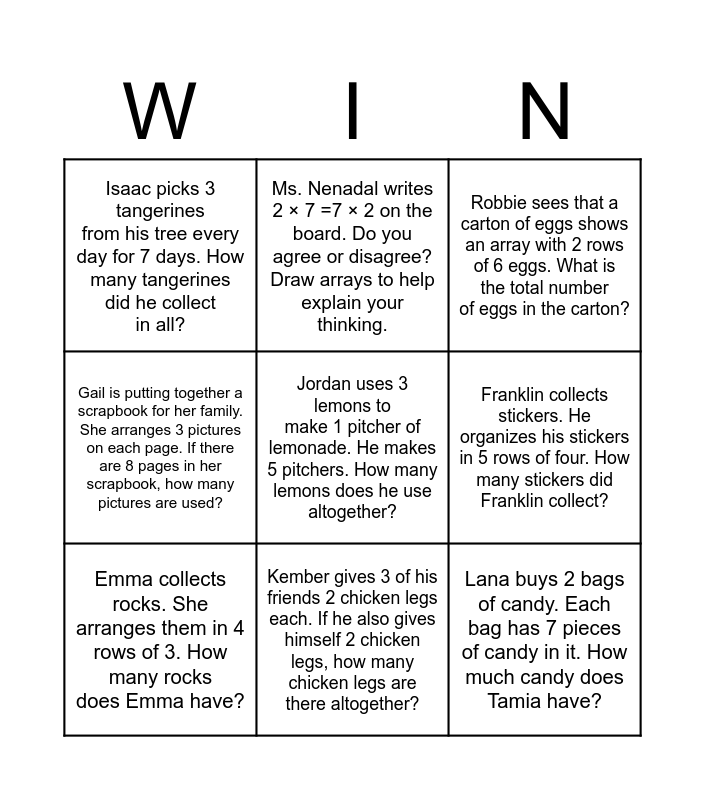 This bingo card has 9 words: Emma collects rocks. She arranges them in 4 rows of 3. How many rocks does Emma have?, Robbie sees that a carton of eggs shows an array with 2 rows of 6 eggs. What is the total number of eggs in the carton?, Ms. Nenadal writes 2 × 7 =7 × 2 on the board. Do you agree or disagree? Draw arrays to help explain your thinking., Gail is putting together a scrapbook for her family. She arranges 3 pictures on each page. If there are 8 pages in her scrapbook, how many pictures are used?, Isaac picks 3 tangerines from his tree every day for 7 days. How many tangerines did he collect in all?, Franklin collects stickers. He organizes his stickers in 5 rows of four. How many stickers did Franklin collect?, Jordan uses 3 lemons to make 1 pitcher of lemonade. He makes 5 pitchers. How many lemons does he use altogether?, Lana buys 2 bags of candy. Each bag has 7 pieces of candy in it. How much candy does Tamia have? and Kember gives 3 of his friends 2 chicken legs each. If he also gives himself 2 chicken legs, how many chicken legs are there altogether?.