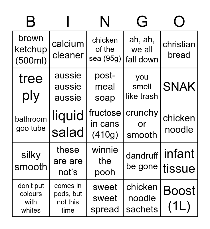 This bingo card has 30 words: comes in pods, but not this time, preserved vitamin A cuts, liquid salad, catch up square! (500ml), brown ketchup (500ml), chicken of the sea (95g), aussie aussie aussie, winnie the pooh, crunchy or smooth, sweet sweet spread, chicken noodle, fructose in cans (410g), chicken noodle sachets, Boost (1L), SNAK, breakfast diet (6 pack), dandruff be gone, silky smooth, these are are not’s, christian bread, bathroom goo tube, hair be gone, calcium cleaner, you smell like trash, tree ply, ah, ah, we all fall down, infant tissue, don’t put colours with whites, post-meal soap and bean container.