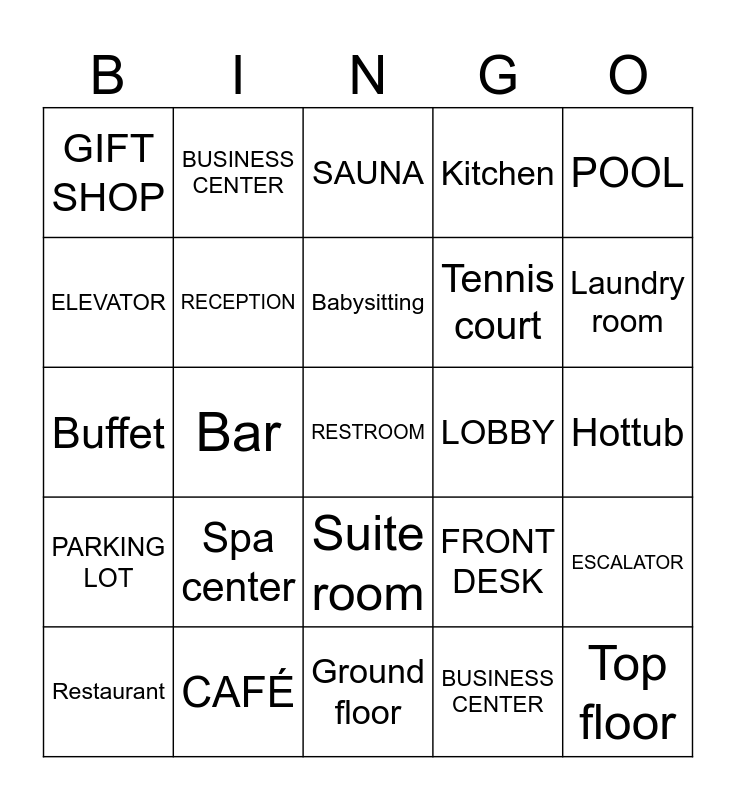 This bingo card has 25 words: PARKING LOT, CAFÉ, RESTROOM, BUSINESS CENTER, POOL, GIFT SHOP, BUSINESS CENTER, SAUNA, LOBBY, ESCALATOR, ELEVATOR, RECEPTION, Ground floor, FRONT DESK, Laundry room, Restaurant, Bar, Babysitting, Tennis court, Hottub, Buffet, Spa center, Suite room, Kitchen and Top floor.