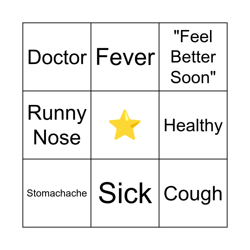 This bingo card has a free space and 14 words: Headache, Toothache, Stomachache, Fever, Runny Nose, Cough, Cold, Sore Throat, Sick, Doctor, Broken Arm, Healthy, "Feel Better Soon" and Cut.