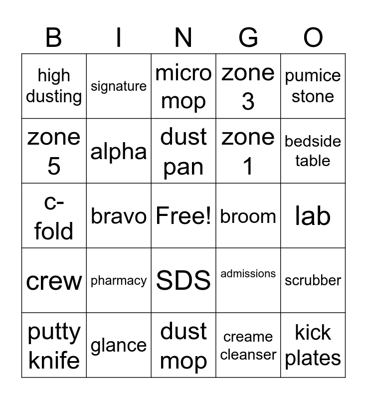 This bingo card has a free space and 60 words: virex 256, glance, prominence, crew, creame cleanser, oxivir, alpha, stride, zone 1, zone 2, zone 3, zone 4, zone 5, corners, edges, high dusting, kick plates, pumice stone, magic eraser, dust pan, broom, micro mop, putty knife, scrubber, buffer, call button, bsc, overbed table, bedside table, furniture, shower, toilet, flush valve, preston, signature, vector, pro stripper, bravo, emotion roll, c-fold, trash can, pharmacy, lab, radiology, admissions, java, ER, CVRA, PACU, SDS, dust mop, med room, soil room, supply room, linen, scrubs, curtains, bio hazard, blinds and window sill.
