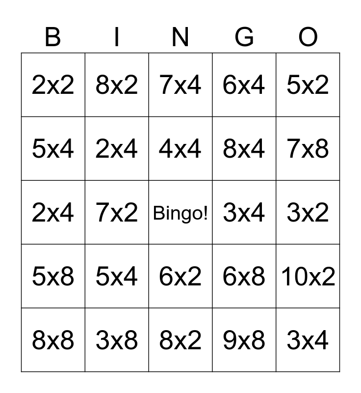 This bingo card has a free space and 24 words: 5x4, 3x8, 4x4, 8x8, 5x2, 2x2, 5x4, 8x2, 3x4, 6x2, 8x4, 2x4, 6x8, 10x2, 2x4, 9x8, 3x2, 7x4, 7x8, 7x2, 3x4, 5x8, 6x4 and 8x2.
