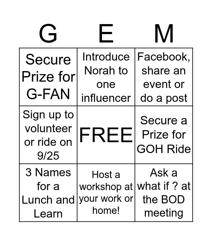 This bingo card has a free space and 8 words: Secure a Prize for GOH Ride, Facebook, share an event or do a post, Introduce Norah to one influencer, 3 Names for a Lunch and Learn, Secure Prize for G-FAN, Ask a what if ? at the BOD meeting, Sign up to volunteer or ride on 9/25 and Host a workshop at your work or home!.