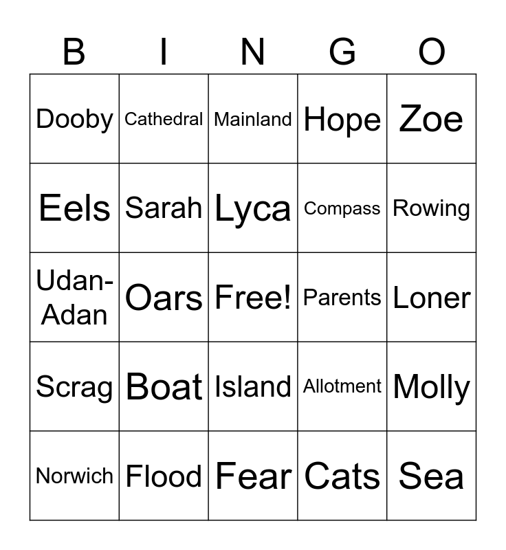 This bingo card has a free space and 24 words: Boat, Flood, Lyca, Norwich, Zoe, Dooby, Eels, Cathedral, Parents, Island, Compass, Udan-Adan, Allotment, Molly, Sarah, Cats, Loner, Mainland, Rowing, Oars, Sea, Scrag, Hope and Fear.