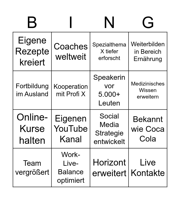 This bingo card has 19 words: Social Media Strategie entwickelt, Mehr Freizeit, Spezialthema X tiefer erforscht, Live Kontakte, Bekannt wie Coca Cola, Fortbildung im Ausland, Horizont erweitert, Eigene Rezepte kreiert, Coaches weltweit, Online-Kurse halten, Eigenen YouTube Kanal, Kooperation mit Profi X, Speakerin vor 5.000+ Leuten, Work- Live-Balance optimiert, Team vergrößert, X pro Monat, Weiterbilden in Bereich Ernährung, Medizinisches Wissen erweitern and Am Strand liegen und nichts tun.
