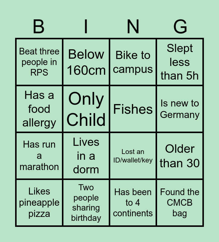 This bingo card has 16 words: Likes pineapple pizza, Two people sharing birthday, Bike to campus, Slept less than 5h, Has a food allergy, Below 160cm, Lost an ID/wallet/key, Older than 30, Beat three people in RPS, Only Child, Has been to 4 continents, Is new to Germany, Has run a marathon, Lives in a dorm, Fishes and Found the CMCB bag.