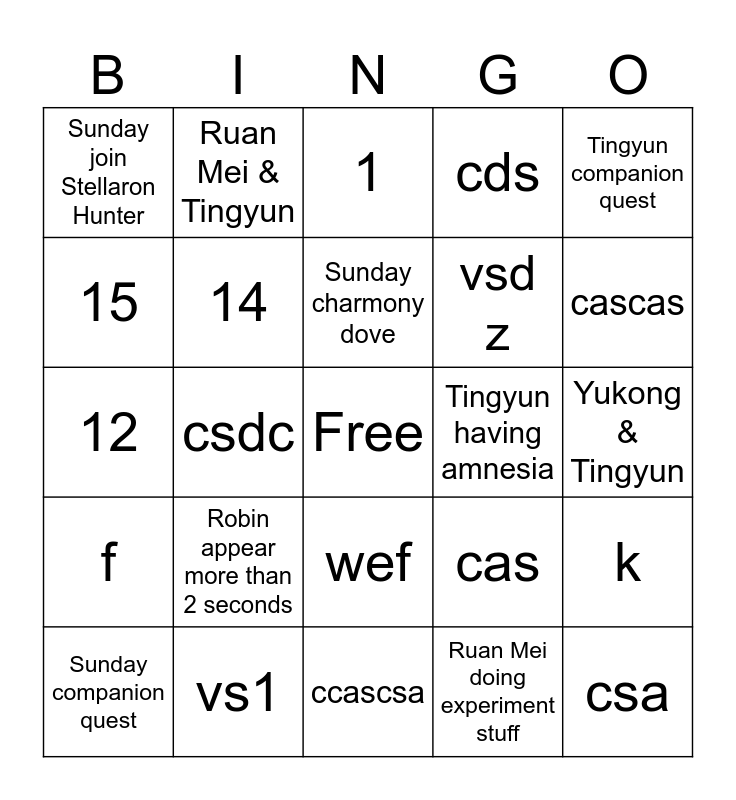 This bingo card has a free space and 24 words: Sunday companion quest, Robin appear more than 2 seconds, Sunday charmony dove, Ruan Mei doing experiment stuff, Tingyun companion quest, Sunday join Stellaron Hunter, Ruan Mei & Tingyun, 1, Tingyun having amnesia, Yukong & Tingyun, 12, 14, cas, k, 15, vs1, ccascsa, cds, cascas, f, csdc, wef, vsd z and csa.