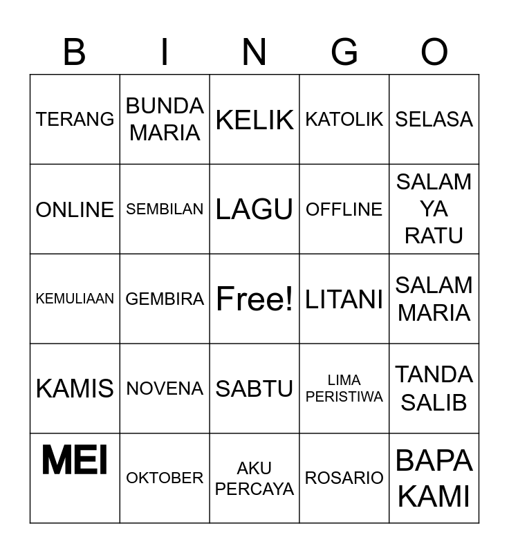 This bingo card has a free space and 29 words: MEI, MULIA, GEMBIRA, SEDIH, TERANG, KELIK, SEMBILAN, NOVENA, LITANI, OKTOBER, SALAM MARIA, BAPA KAMI, AKU PERCAYA, ROSARIO, SALAM YA RATU, BACAAN RENUNGAN, SABTU, KAMIS, SELASA, KEMULIAAN, LIMA PERISTIWA, TERPUJIAH, OFFLINE, ONLINE, KATOLIK, BUNDA MARIA, TANDA SALIB, LAGU and MAKANAN.