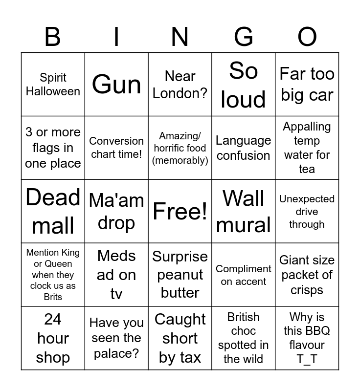 This bingo card has a free space and 24 words: Meds ad on tv, Have you seen the palace?, Amazing/ horrific food (memorably), 24 hour shop, Far too big car, Spirit Halloween, 3 or more flags in one place, Gun, Wall mural, Surprise peanut butter, Language confusion, Dead mall, Compliment on accent, Giant size packet of crisps, Conversion chart time!, British choc spotted in the wild, Unexpected drive through, Near London?, Appalling temp water for tea, Ma'am drop, Why is this BBQ flavour T_T, Mention King or Queen when they clock us as Brits, So loud and Caught short by tax.