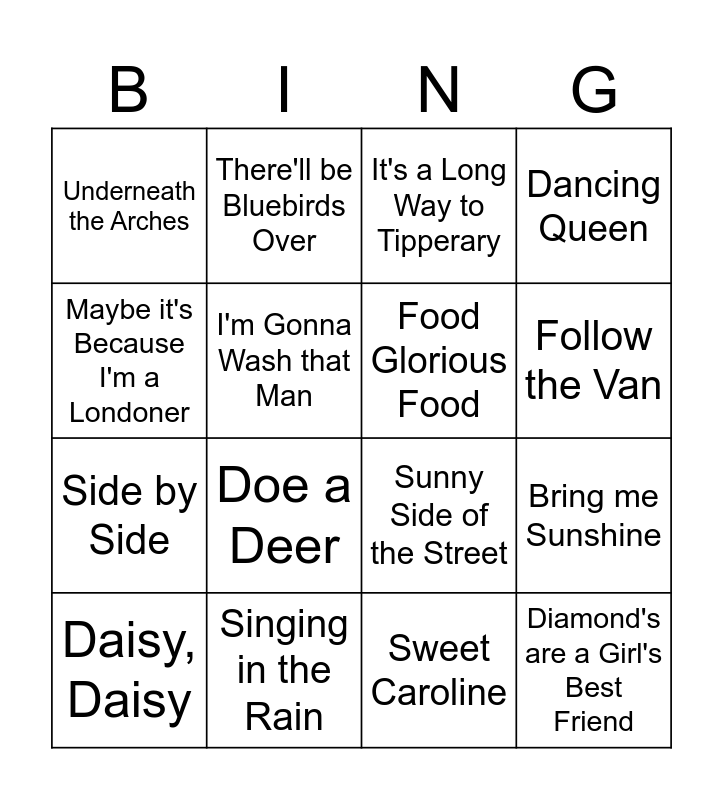 This bingo card has 20 words: Bring me Sunshine, Lambeth Walk, It's a Long Way to Tipperary, I'm Forever Blowing Bubbles, Daisy, Daisy, Maybe it's Because I'm a Londoner, Singing in the Rain, Underneath the Arches, Side by Side, There'll be Bluebirds Over, Doe a Deer, Sunny Side of the Street, I'm Gonna Wash that Man, Diamond's are a Girl's Best Friend, Food Glorious Food, We'll meet again, Follow the Van, Dancing Queen, Sweet Caroline and Pretty Woman.