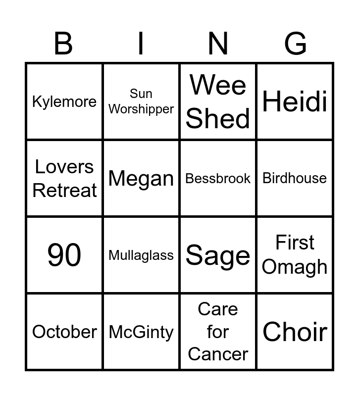 This bingo card has 35 words: Free!, Powers, Trillick, Bessbrook, Roberta, Heidi, Megan, Caravan, Birdhouse, Steak, Sage, Lovers Retreat, BMW, Wethers Originals, Kylemore, McGinty, BBQ, First Omagh, Choir, October, R.O.C, iPad, Great Hair, Radio Ulster, Wee Shed, Mullaglass, Mustard, Ginger, 90, Care for Cancer, Granda, Probus, Sharp Dresser, Sun Worshipper and Handyman.