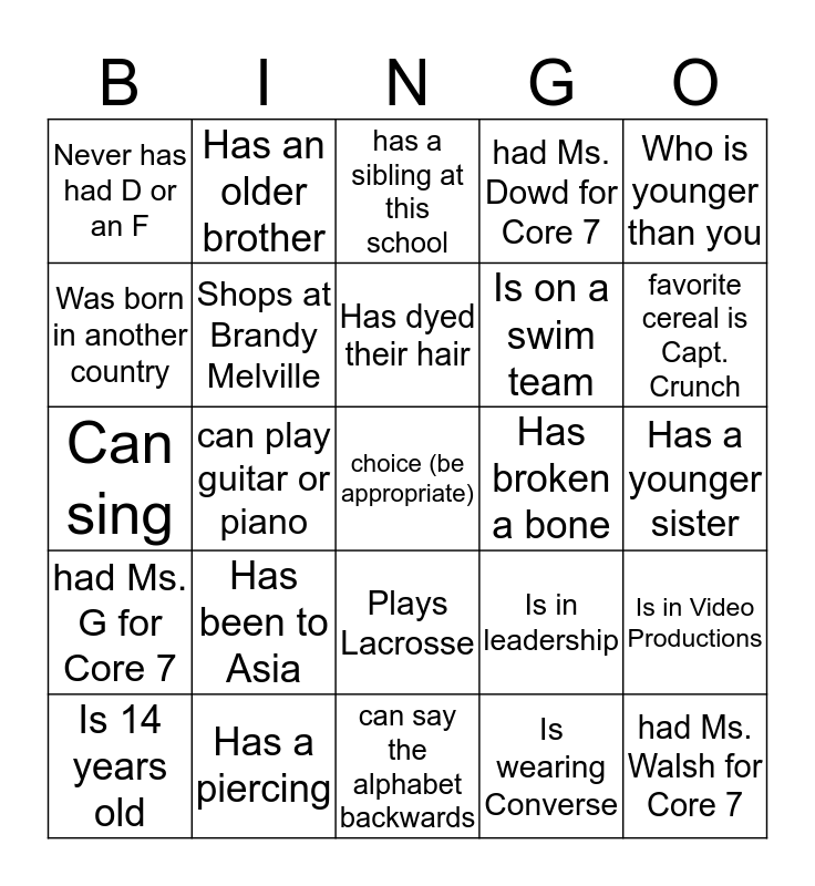 This bingo card has a free space and 24 words: Has been to Asia, Has a piercing, Has dyed their hair, Is 14 years old, Who is younger than you, Never has had D or an F, Was born in another country, Has an older brother, Has broken a bone, Plays Lacrosse, Is on a swim team, Can sing, Is in leadership, Is in Video Productions, Shops at Brandy Melville, Is wearing Converse, Has a younger sister, has a sibling at this school, favorite cereal is Capt. Crunch, can play guitar or piano, had Ms. Walsh for Core 7, had Ms. G for Core 7, had Ms. Dowd for Core 7 and can say the alphabet backwards.
