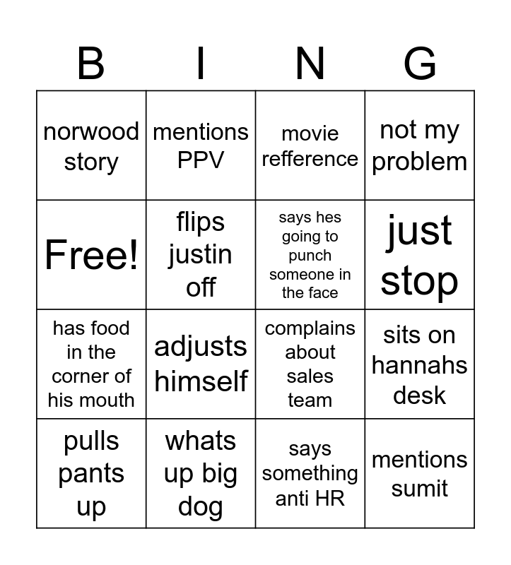 This bingo card has 16 words: whats up big dog, sits on hannahs desk, movie refference, norwood story, has food in the corner of his mouth, mentions PPV, complains about sales team, says something anti HR, Free!, flips justin off, pulls pants up, not my problem, adjusts himself, just stop, says hes going to punch someone in the face and mentions sumit.