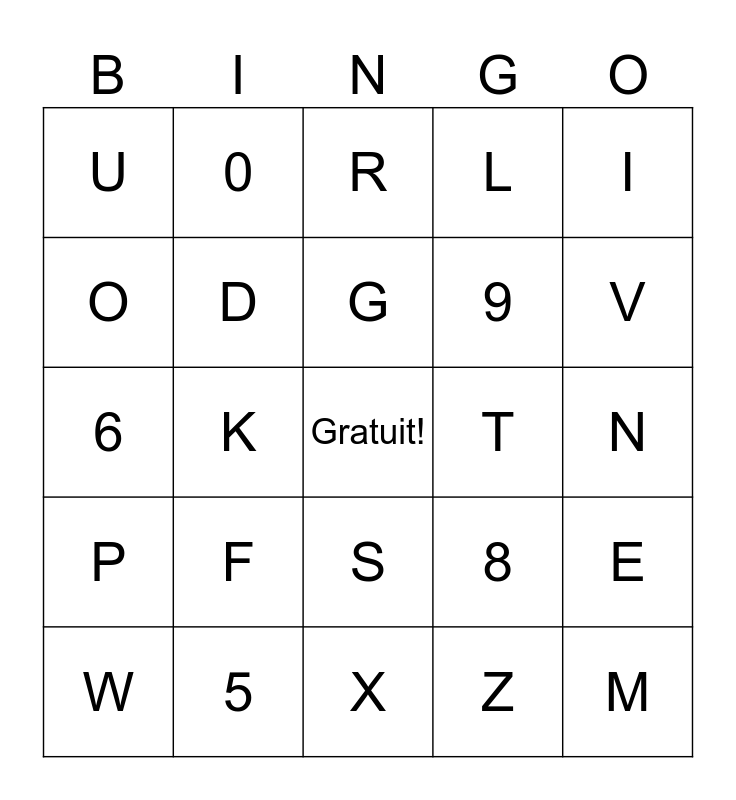This bingo card has a free space and 37 words: A, B, C, D, E, F, G, H, I, J, K, L, M, N, O, P, Q, R, S, T, U, V, W, X, Y, Z, 0, 1, 2, 3, 4, 5, 6, 7, 8, 9 and 10.