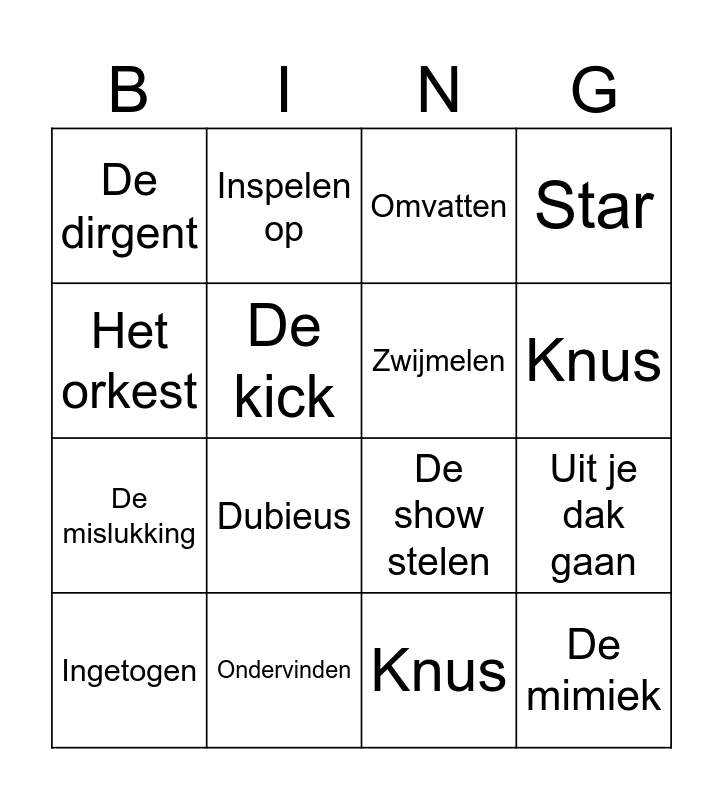 This bingo card has 24 words: Likkebaarden, De sfeer, Knus, Trachten, Het orkest, De dirgent, De kick, Inspelen op, Ondervinden, De pre, De mislukking, De show stelen, Het effect, Flexibel, Zwijmelen, Charmant, Knus, Omvatten, Dubieus, Uit je dak gaan, Ingetogen, De mimiek, Star and Sidderen.