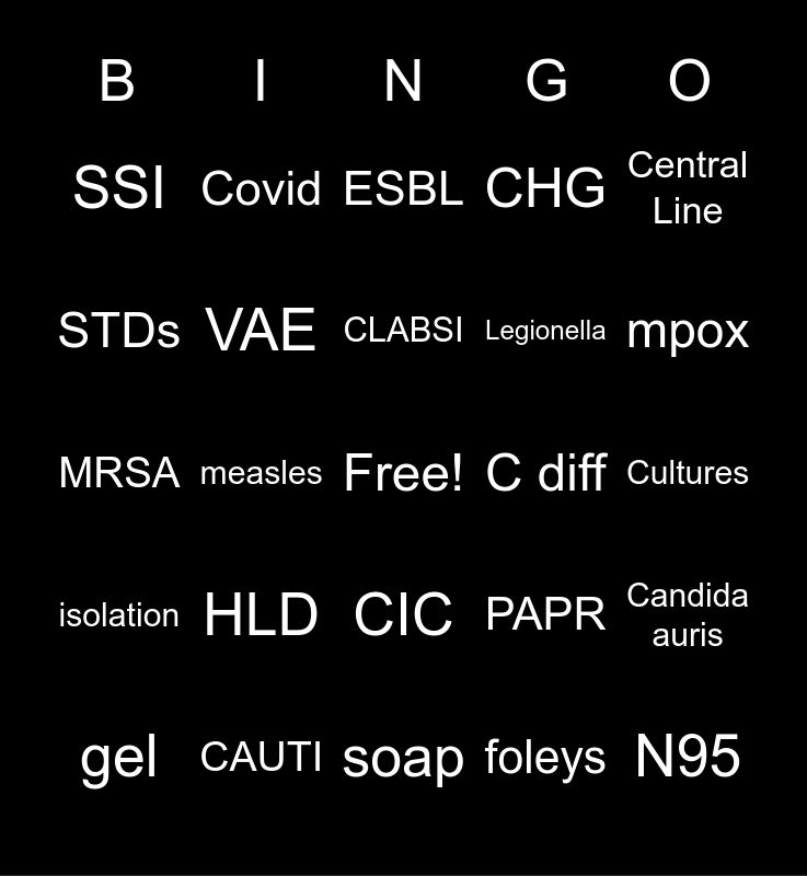 This bingo card has a free space and 28 words: Hand Hygiene, CAUTI, CLABSI, foleys, Central Line, SSI, VAE, soap, C diff, Candida auris, MRSA, measles, PAPR, N95, STDs, Ebola, CIC, CHG, mpox, gel, Covid, PPE, Legionella, Cultures, isolation, HLD, ESBL and CRE.