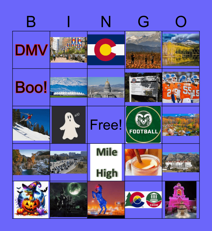 This bingo card has 30 images, a free space and 4 words: Vehicle Services, Trick or Treat, DMV and Boo!.