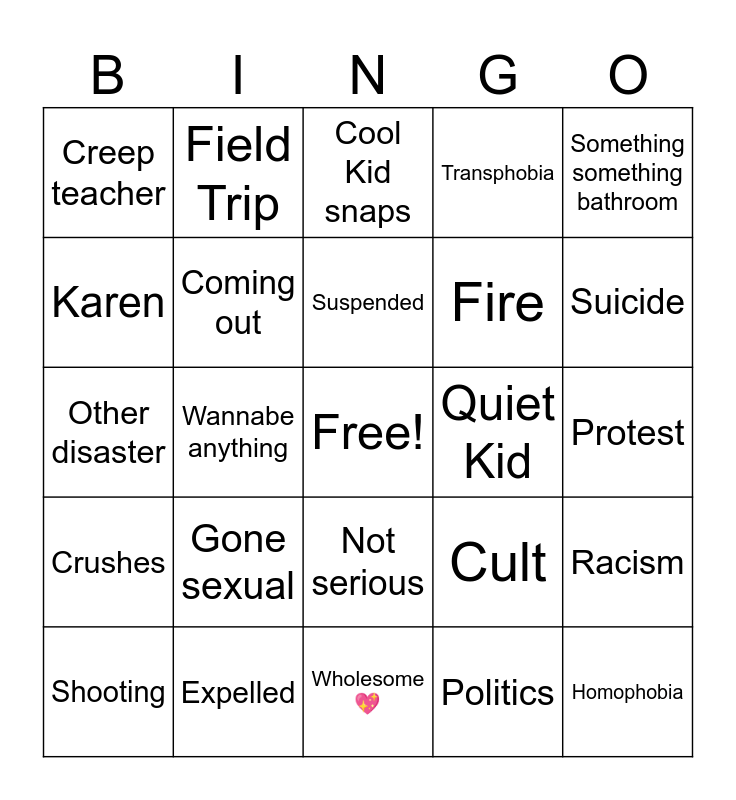 This bingo card has a free space and 24 words: Gone sexual, Expelled, Suspended, Shooting, Something something bathroom, Creep teacher, Karen, Field Trip, Quiet Kid, Not serious, Fire, Other disaster, Cult, Racism, Coming out, Politics, Protest, Cool Kid snaps, Suicide, Wannabe anything, Homophobia, Crushes, Transphobia and Wholesome💖.