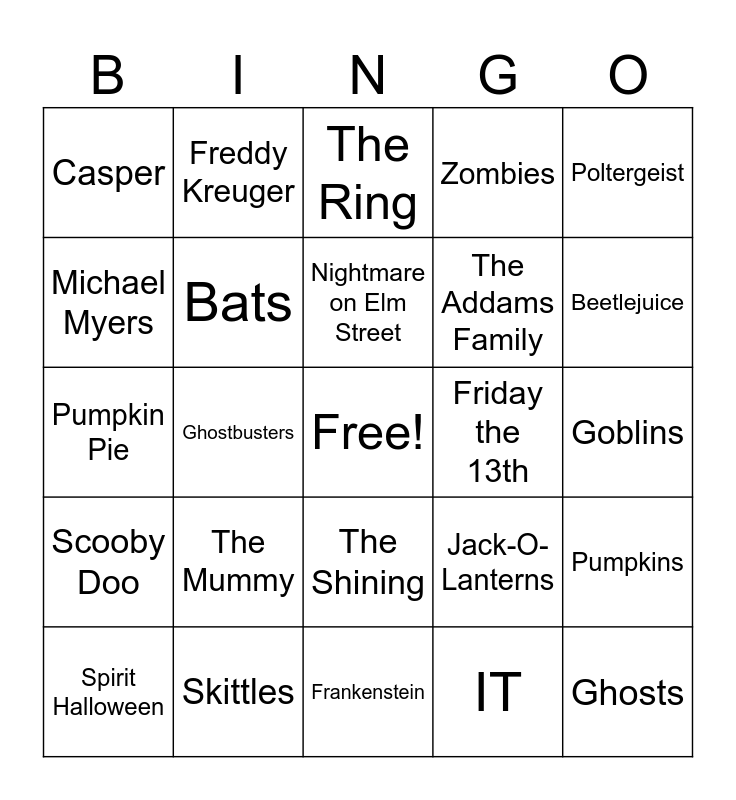 This bingo card has a free space and 50 words: Trick or Treat, Ghosts, Dracula, Frankenstein, The Mummy, The Invisible Man, Freddy Kreuger, Jason Vorhees, Michael Myers, Werewolf, Bats, Zombies, Pumpkins, Jack-O-Lanterns, Haunted House, Hocus Pocus, Nightmare on Elm Street, Friday the 13th, Scream, Poltergeist, Ghostbusters, IT, Casper, The Addams Family, Goosebumps, Hotel Transylvania, Beetlejuice, Candy Man, The Ring, The Shining, It's the Great Pumpkin, Charlie Brown, Rocky Horror Picture Show, Milky Way, Starburst, Skittles, Twix, Snickers, Silence of the Lambs, Haunted Mansion, Goblins, Gremlins, Ouija Board, Bobbing for Apples, Full Moon, Spirit Halloween, Pumpkin Pie, The Ring, The Exorcist, Scooby Doo and Tower of Terror.