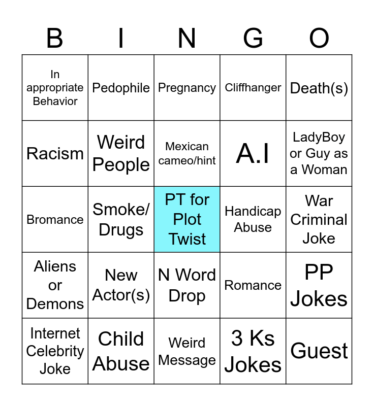 This bingo card has a free space and 24 words: New Actor(s), Child Abuse, Mexican cameo/hint, Internet Celebrity Joke, Death(s), In appropriate Behavior, Racism, Pedophile, Handicap Abuse, N Word Drop, A.I, Bromance, Romance, PP Jokes, Weird People, 3 Ks Jokes, War Criminal Joke, Pregnancy, LadyBoy or Guy as a Woman, Smoke/ Drugs, Guest, Aliens or Demons, Cliffhanger and Weird Message.