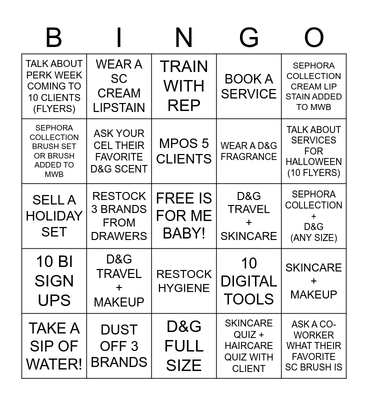 This bingo card has a free space and 24 words: D&G TRAVEL + MAKEUP, DUST OFF 3 BRANDS, MPOS 5 CLIENTS, TAKE A SIP OF WATER!, SEPHORA COLLECTION CREAM LIP STAIN ADDED TO MWB, TALK ABOUT PERK WEEK COMING TO 10 CLIENTS (FLYERS), SEPHORA COLLECTION BRUSH SET OR BRUSH ADDED TO MWB, WEAR A SC CREAM LIPSTAIN, D&G TRAVEL + SKINCARE, RESTOCK HYGIENE, WEAR A D&G FRAGRANCE, SELL A HOLIDAY SET, 10 DIGITAL TOOLS, SKINCARE + MAKEUP, ASK YOUR CEL THEIR FAVORITE D&G SCENT, SKINCARE QUIZ + HAIRCARE QUIZ WITH CLIENT, SEPHORA COLLECTION + D&G (ANY SIZE), TRAIN WITH REP, TALK ABOUT SERVICES FOR HALLOWEEN (10 FLYERS), RESTOCK 3 BRANDS FROM DRAWERS, ASK A CO-WORKER WHAT THEIR FAVORITE SC BRUSH IS, 10 BI SIGN UPS, BOOK A SERVICE and D&G FULL SIZE.