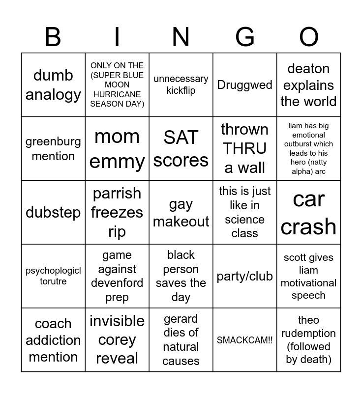 This bingo card has a free space and 24 words: game against devenford prep, invisible corey reveal, SAT scores, coach addiction mention, deaton explains the world, dumb analogy, greenburg mention, ONLY ON THE (SUPER BLUE MOON HURRICANE SEASON DAY), this is just like in science class, black person saves the day, thrown THRU a wall, dubstep, party/club, scott gives liam motivational speech, mom emmy, SMACKCAM!!, car crash, unnecessary kickflip, liam has big emotional outburst which leads to his hero (natty alpha) arc, parrish freezes rip, theo rudemption (followed by death), psychoplogicl torutre, Druggwed and gerard dies of natural causes.