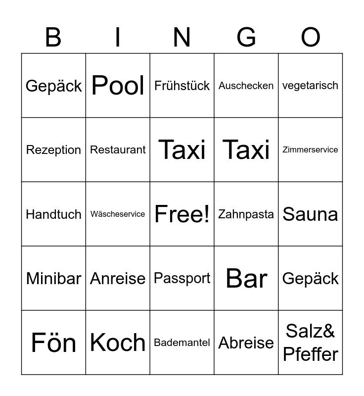 This bingo card has a free space and 24 words: Anreise, Koch, Taxi, Fön, vegetarisch, Gepäck, Rezeption, Pool, Zahnpasta, Passport, Taxi, Handtuch, Bar, Gepäck, Restaurant, Abreise, Sauna, Frühstück, Zimmerservice, Wäscheservice, Salz& Pfeffer, Minibar, Auschecken and Bademantel.