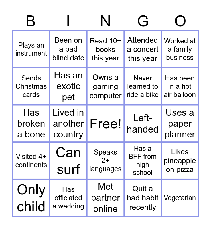 This bingo card has a free space and 29 words: Only child, Twin or triplet, Lived in another country, Hand-made an outfit, Plays an instrument, Read 10+ books this year, Has an exotic pet, Can surf, Left-handed, Has officiated a wedding, Uses a paper planner, Vegetarian, Met partner online, Quit a bad habit recently, Has been in a hot air balloon, Was in a wedding party this year, Speaks 2+ languages, Visited 4+ continents, Worked at a family business, Has broken a bone, Has a BFF from high school, Recently handmade a gift, Never learned to ride a bike, Sends Christmas cards, Attended a concert this year, Been on a bad blind date, Likes pineapple on pizza, Owns a gaming computer and Knows ASL.