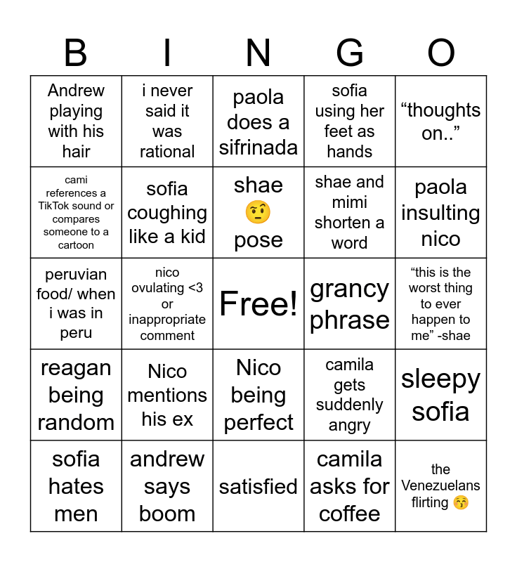 This bingo card has a free space and 24 words: Nico mentions his ex, andrew says boom, shae 🤨 pose, sofia hates men, “thoughts on..”, Andrew playing with his hair, cami references a TikTok sound or compares someone to a cartoon, i never said it was rational, grancy phrase, Nico being perfect, shae and mimi shorten a word, peruvian food/ when i was in peru, camila gets suddenly angry, sleepy sofia, sofia coughing like a kid, camila asks for coffee, “this is the worst thing to ever happen to me” -shae, paola does a sifrinada, paola insulting nico, nico ovulating <3 or inappropriate comment, the Venezuelans flirting 😚, reagan being random, sofia using her feet as hands and satisfied.