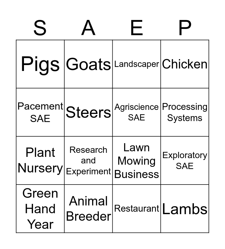 This bingo card has a free space and 15 words: Green Hand Year, Lambs, Landscaper, Pigs, Processing Systems, Pacement SAE, Research and Experiment, Restaurant, Steers, Plant Nursery, Exploratory SAE, Chicken, Agriscience SAE, Goats and Animal Breeder.