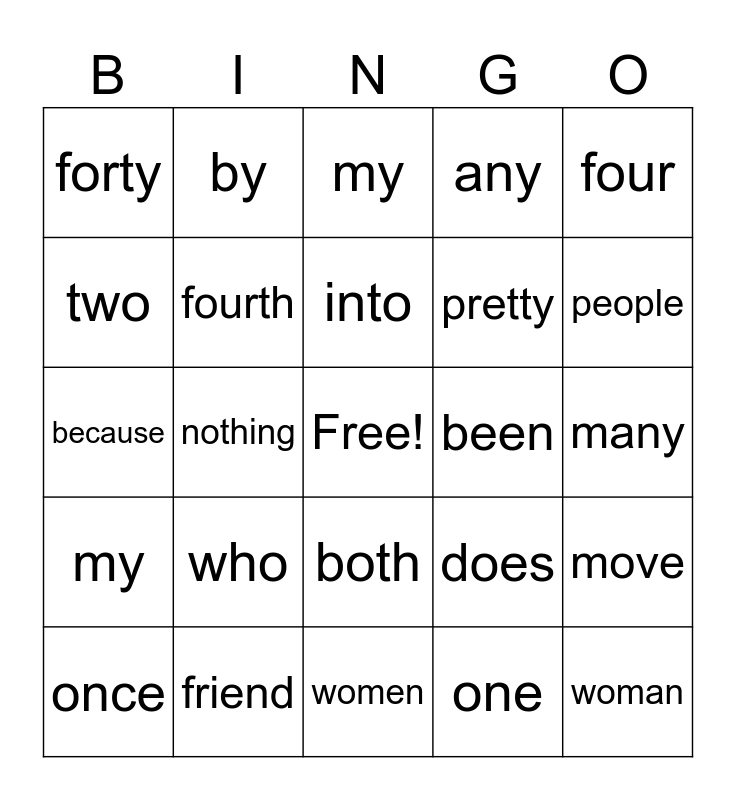 This bingo card has a free space and 24 words: who, friend, into, once, four, forty, two, by, been, both, pretty, because, does, move, fourth, one, many, my, people, nothing, woman, my, any and women.