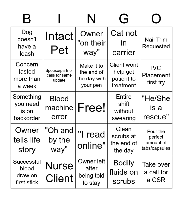 This bingo card has a free space and 24 words: "Oh and by the way", Nurse Client, Make it to the end of the day with your pen, Successful blood draw on first stick, Nail Trim Requested, Dog doesn't have a leash, Concern lasted more than a week, Intact Pet, Entire shift without swearing, "I read online", Client wont help get patient to treatment, Something you need is on backorder, Clean scrubs at the end of the day, Pour the perfect amount of tabs/capsules, Spouse/partner calls for same update, Bodily fluids on scrubs, "He/She is a rescue", Owner "on their way", IVC Placement first try, Blood machine error, Take over a call for a CSR, Owner tells life story, Cat not in carrier and Owner left after being told to stay.