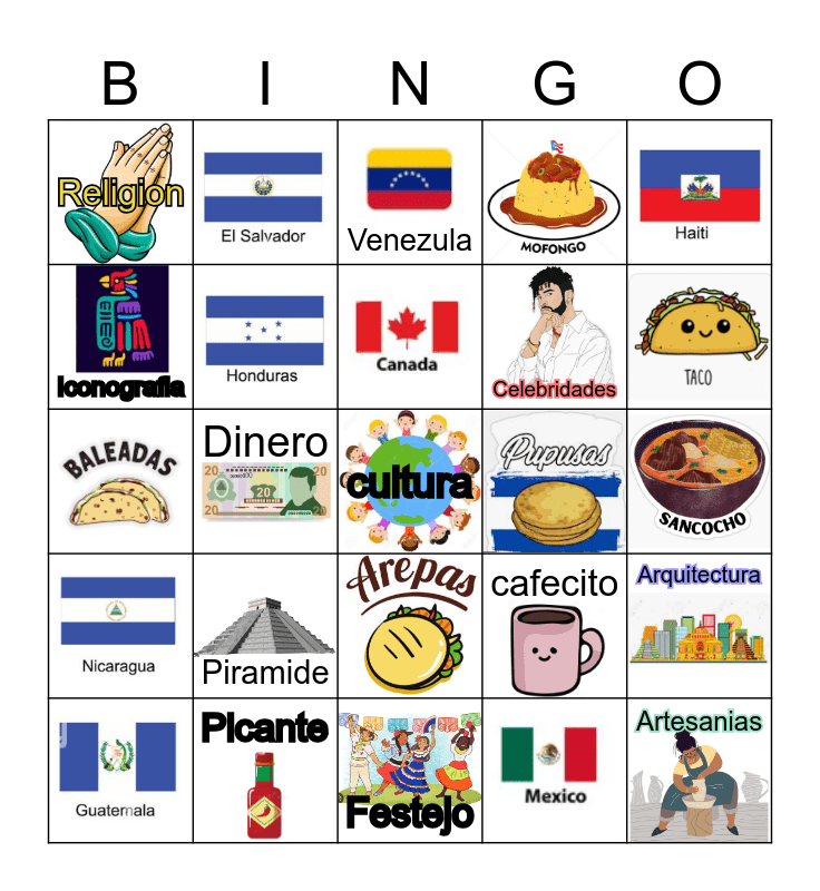 This bingo card has 34 images, a free space and 16 words: Venezula, Colombia, Ecuador, Picante, Piramide, cafecito, Baile, Religion, Festejo, Artesanias, Celebridades, Iconografia, Vestidura, Dinero, Arquitectura and Familia.