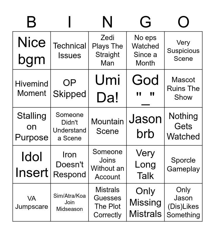 This bingo card has a free space and 24 words: Iron Doesn't Respond, Sim/Atra/Koa Join Midseason, Umi Da!, VA Jumpscare, Very Suspicious Scene, Nice bgm, Hivemind Moment, Technical Issues, Jason brb, Someone Joins Without an Account, God ''_", Stalling on Purpose, Very Long Talk, Sporcle Gameplay, OP Skipped, Only Missing Mistrals, Nothing Gets Watched, Zedi Plays The Straight Man, Mascot Ruins The Show, Someone Didn't Understand a Scene, Only Jason (Dis)Likes Something, Idol Insert, No eps Watched Since a Month and Mistrals Guesses The Plot Correctly.