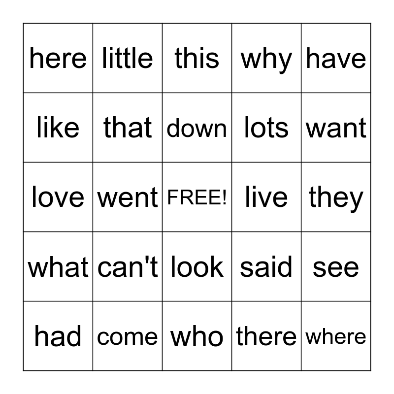 This bingo card has a free space and 24 words: can't, come, down, had, have, here, like, little, live, look, lots, love, said, see, that, there, they, this, want, went, where, what, why and who.