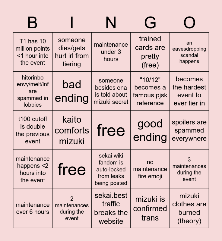 This bingo card has a free space and 24 words: maintenance over 6 hours, free, someone besides ena is told about mizuki secret, mizuki is confirmed trans, an eavesdropping scandal happens, T1 has 10 million points <1 hour into the event, someone dies/gets hurt irl from tiering, maintenance under 3 hours, good ending, spoilers are spammed everywhere, t100 cutoff is double the previous event, bad ending, no maintenance fire emoji, 3 maintenances during the event, hitorinbo envy/melt/lnf are spammed in lobbies, 2 maintenances during the event, sekai.best traffic breaks the website, trained cards are pretty (free), becomes the hardest event to ever tier in, maintenance happens <2 hours into the event, kaito comforts mizuki, sekai wiki fandom is auto-locked from leaks being posted, "10/12" becomes a famous pjsk reference and mizuki clothes are burned (theory).