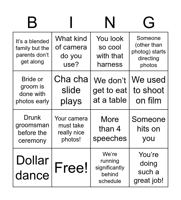 This bingo card has 28 words: I used to be a photographer, I love how you just took charge, Drunk groomsman before the ceremony, Groom cries, Cha cha slide plays, You look so cool with that harness, What kind of camera do you use?, You’re doing such a great job!, Free!, Did you take any good ones?, More than 4 speeches, Someone (other than photog) starts directing photos, What’s your real job?, Can you make me look skinny/younger?, Your camera must take really nice photos!, One large family shot (with everybody), The videographer starts taking over, We don’t get to eat at a table, We used to shoot on film, How long are you here for?, It’s a blended family but the parents don’t get along, Bride and groom specifically thank us in their speech, Dollar dance, Someone hits on you, We’re running significantly behind schedule, Cupid shuffle plays, Bride or groom is done with photos early and We’re running significantly early.