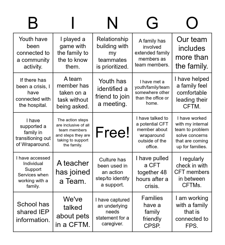 This bingo card has a free space and 24 words: A teacher has joined a Team., We've talked about pets in a CFTM., Youth has identified a friend to join a meeting., School has shared IEP information., Our team includes more than the family., Youth have been connected to a community activity., If there has been a crisis, I have connected with the hospital., I played a game with the family to the to know them., I have talked to a potential CFT member about wraparound outside of the office., Culture has been used in an action step/to identify a support., I have met a youth/family/team somewhere other than the office or home., I have supported a family in transitioning out of Wraparound., I have pulled a CFT together 48 hours after a crisis., I regularly check in with CFT members in between CFTMs., A team member has taken on a task without being asked., Families have a family friendly CPSP., I have worked with my internal team to problem solve concerns that are coming up for families., Relationship building with my teammates is prioritized., I have helped a family feel comfortable leading their CFTM., The action steps are inclusive of all team members and steps they are taking to support the family., I am working with a family that is connected to FPS., I have accessed Individual Support Services when working with a family., A family has involved extended family members as team members. and I have captured an underlying needs statement for a caregiver..