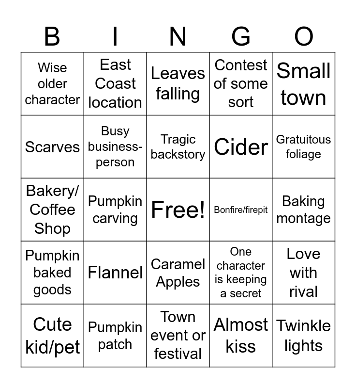 This bingo card has a free space and 24 words: Flannel, Pumpkin patch, Tragic backstory, Cute kid/pet, Small town, Wise older character, Scarves, East Coast location, Bonfire/firepit, Caramel Apples, Cider, Bakery/ Coffee Shop, One character is keeping a secret, Love with rival, Busy business-person, Almost kiss, Baking montage, Leaves falling, Gratuitous foliage, Pumpkin carving, Twinkle lights, Pumpkin baked goods, Contest of some sort and Town event or festival.