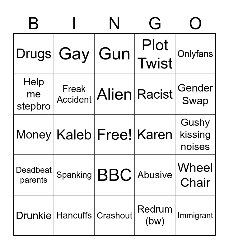 This bingo card has a free space and 24 words: Spanking, Hancuffs, Alien, Drunkie, Onlyfans, Drugs, Help me stepbro, Gay, Karen, BBC, Racist, Money, Abusive, Wheel Chair, Freak Accident, Redrum (bw), Gushy kissing noises, Gun, Gender Swap, Kaleb, Immigrant, Deadbeat parents, Plot Twist and Crashout.