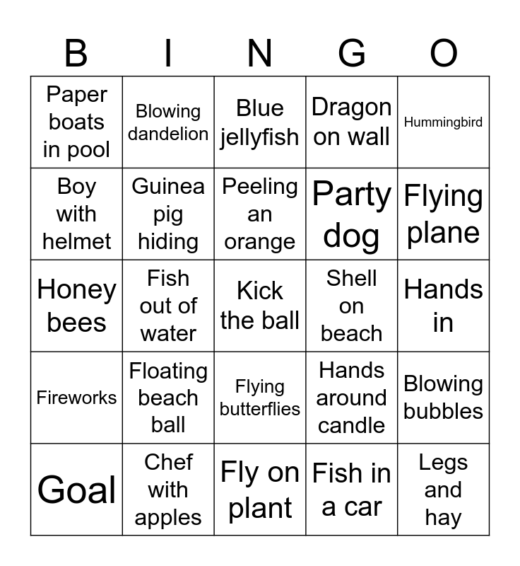 This bingo card has a free space and 49 words: Spider web, Apple basket, Strawberry hands, Fish in a car, Hands in, Apple splash, Blowing dandelion, Gumballs in the sky, Party dog, Duck duck goose, Boy with helmet, Fish out of water, Hands around candle, Legs and hay, Butterfly escape, Baseball field, Blue jellyfish, Shell on beach, Christmas baubles, Paper boats in pool, Chef with apples, Fly on plant, Dragon on wall, Hummingbird, Frogs and liypads, Floating beach ball, Peeling an orange, Anemone clown fish, Blowing bubbles, Fireworks, Scuba gear, Flying butterflies, Girl in poppy field, Easter eggs, Goal, Water slide, Pantied hands, Popcorn and ticket, Flying plane, Baseball boy, Umbrellas, Ladybug on a flower, Butterfly and flower, Racing rabbit, Honey bees, Guinea pig hiding, Lifesaving ring, Starfish and Plastic ducks.