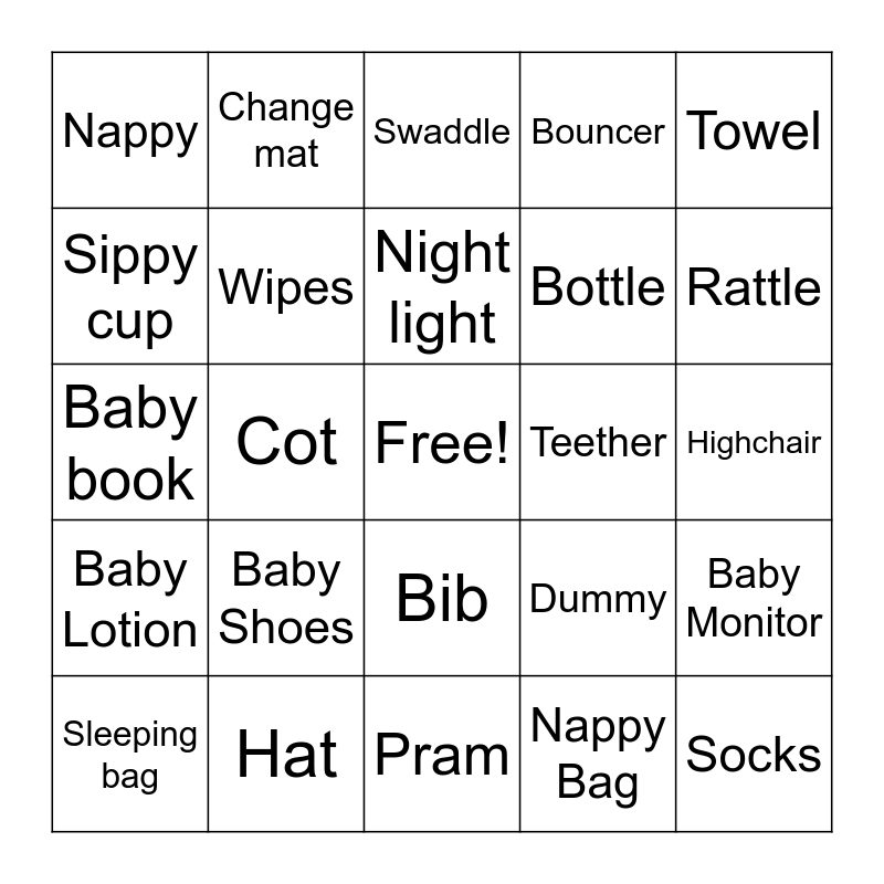 This bingo card has a free space and 31 words: Pram, Car seat, Cot, Bassinett, Nappy, Swaddle, Wipes, Dummy, Teether, Nappy Bag, Highchair, Socks, Blanket, Bathtub, Rattle, Teddy, Baby Monitor, Baby Shoes, Baby Lotion, Bib, Towel, Onesie, Sleeping bag, Change mat, Bottle, Sippy cup, Bouncer, Baby book, Hat, Night light and Toys.