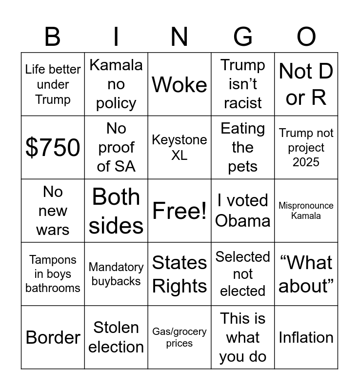 This bingo card has a free space and 36 words: Agree to disagree, “Illegals” getting free stuff, Pro-birth, No proof of SA, Selected not elected, Tampons in boys bathrooms, Keystone XL, Do your research, Not D or R, 13 unalived soldiers, Both sides, Trump isn’t racist, Not good w/ foreign leaders, I voted Obama, Trump not project 2025, Life better under Trump, Migrant crime, Mandatory buybacks, Inflation, Woke, Mispronounce Kamala, “What about”, Stolen election, Border, Gas/grocery prices, Kamala no policy, No new wars, Phobias/isms, Eating the pets, $750, Common sense, What if Trump wins?, This is what you do, States Rights, I’m nice/I like/I get along with… and Defund the police.